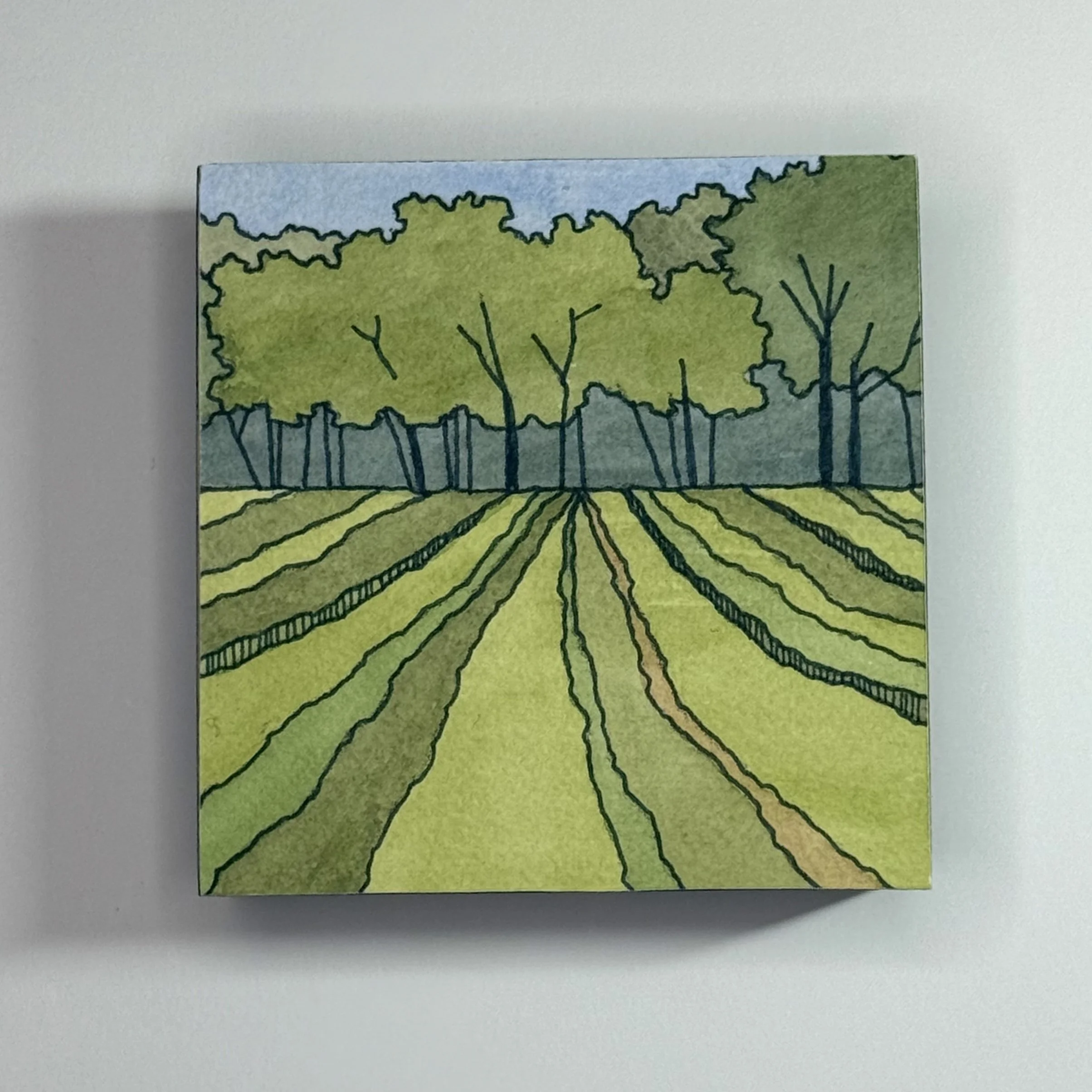This painting is mounted on a 1.5 inch think cradled wood panel. The surface is treated with a UV protectant and wax to eliminate the need for glass. This is the perfect size to display on a bookcase or framed and hung traditionally.