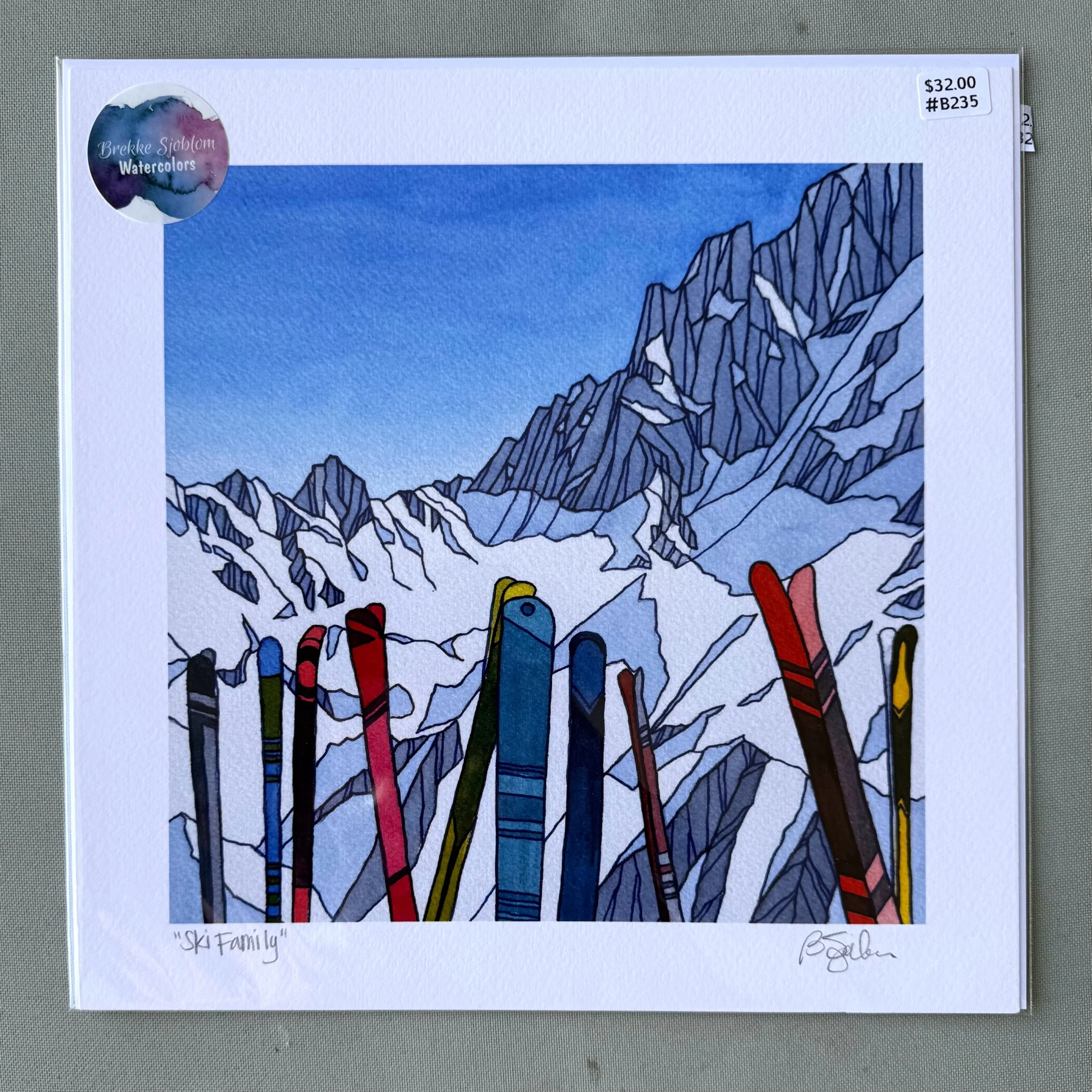 High quality reproduction of my original painting depicting a variety of skis against a mountain backdrop. Did you grow up skiing with your family? Such a great family activity.