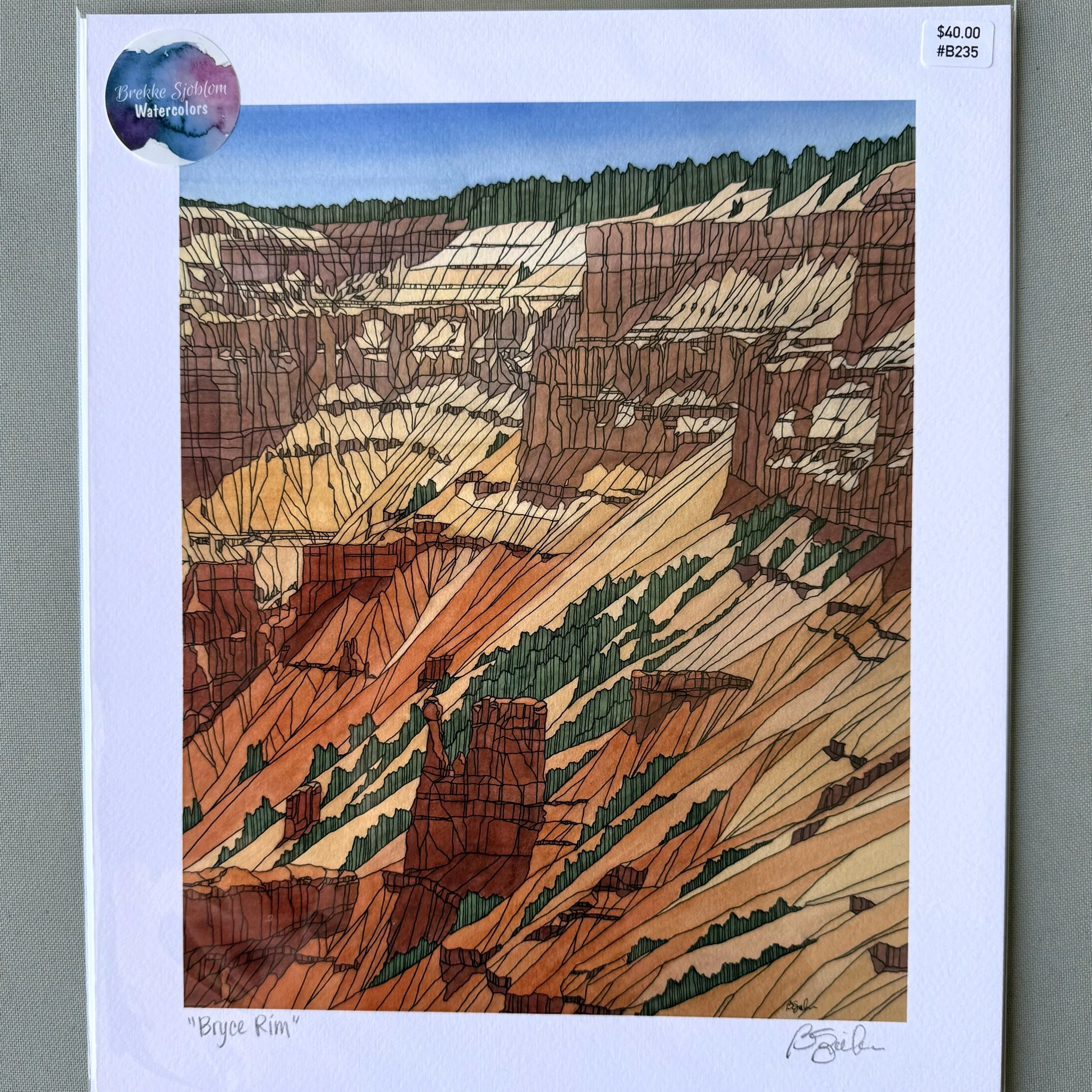 Bryce Canyon is one of those places that you don’t understand the scale until you see it in person. This is a high quality reproduction of my original painting of the slope formations of Bryce Canyon.