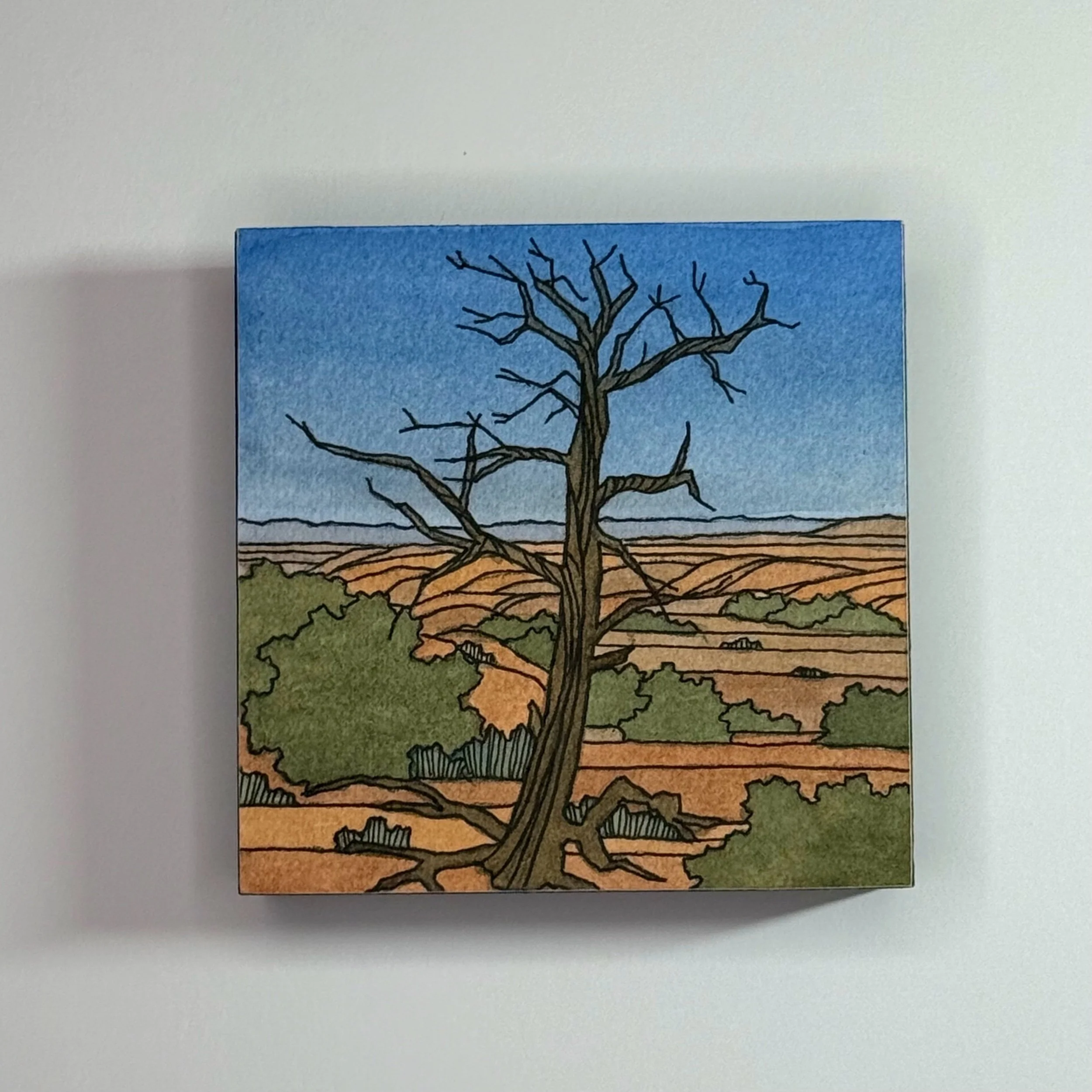 This painting is mounted on a 1.5 inch think cradled wood panel. The surface is treated with a UV protectant and wax to eliminate the need for glass. This is the perfect size to display on a bookcase or framed and hung traditionally.